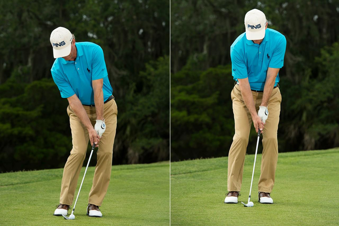 Tư thế đứng hơi nghiêng về phía mục tiêu, để hai cánh tay buông lỏng, tay và đùi không cách nhau quá xa sẽ cho phép cánh tay di chuyển thoải mái khi backswing và down swing, giúp tạo ra sự tiếp xúc giữa mặt gậy và bóng chính xác.